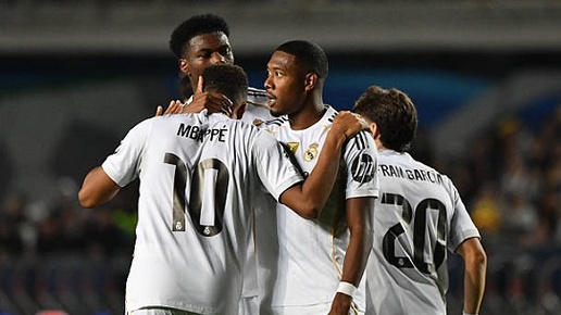 Лига чемпионов. Общий этап, 2-й тур. 30 сентября. Алматы. Стадион "Центральный". Судья - Марко Гуида (Италия). Кайрат (Казахстан) - Реал Мадрид (Испания) - 0:5 (0:1). Голы: Мбаппе, 25 - с пенальти (0:1). Мбаппе, 52 (0:2). Мбаппе, 74 (0:3). Камавинга, 83 (0:4). Диас, 90+3 (0:5). Статистика матча. Онлайн трансляция. Первый домашний матч "Кайрата" в Лиге чемпионов успехом не увенчался. Впрочем, уже сам приезд мадридского "Реала" подарил Алматы праздник. Команда Рафаэля Уразбахтина сыграла смело с грандом и в начале второго тайма вполне могла переломить ход встречи...