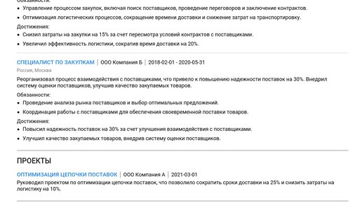 🚀 Пример резюме менеджера по материально-техническому снабжению поможет вам понять, как составить эффективное резюме. Изучение готовых примеров — лучший способ создать документ, который откроет путь к желаемой должности. В этой статье мы собрали готовые примеры резюме менеджера по материально-техническому снабжению для специалистов разного уровня. Вы найдете пошаговые инструкции по каждому разделу, учитывая актуальные требования работодателей: Изучив пример, вы сможете создать резюме с помощью нашего конструктора резюме...