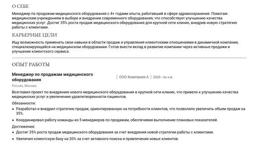 Пример резюме менеджера по продажам медицинского оборудования 2025