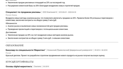 Пример резюме менеджера по продаже рекламы — ваш ключ к созданию сильной самопрезентации. Изучение готового примера поможет составить эффективное резюме и получить работу мечты 🚀. В этом подробном руководстве собрано все, что нужно для успешного старта или развития карьеры менеджера по продаже рекламы. Вы найдете: Изучив этот пример, вы сможете легко создать собственное резюме с помощью нашего конструктора резюме. Заголовок резюме должен четко отражать вашу профессиональную специализацию и уровень опыта...