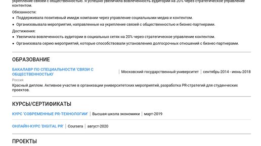 Пример резюме менеджера по связям с общественностью — ваш надежный помощник на пути к новой работе. Изучив готовые примеры, вы сможете составить по-настоящему эффективное резюме и увеличить свои шансы получить желаемую позицию. 🎉 В нашей статье вы найдете подробные пошаговые инструкции по заполнению каждого раздела вашего резюме менеджера по связям с общественностью. Мы расскажем, как правильно оформить контактные данные и блок "О себе", грамотно описать опыт работы, образование и актуальные навыки...