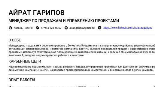 Пример резюме менеджера по продажам и ведению проектов 2025