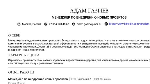 На этой странице вы найдете пример резюме менеджера по внедрению новых проектов 💼. Изучение готовых примеров — лучший способ быстро составить собственное эффективное резюме, ведущее к успешному трудоустройству. Наш подробный материал предоставит пошаговое руководство, как составить резюме, отвечающее всем современным требованиям работодателей 💡. Изучив пример, вы сможете создать резюме с помощью нашего конструктора резюме. Заголовок резюме должен четко отражать вашу специализацию и уровень профессионализма...