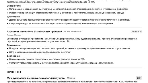 Пример резюме менеджера выставочных проектов 2025 - готовые примеры