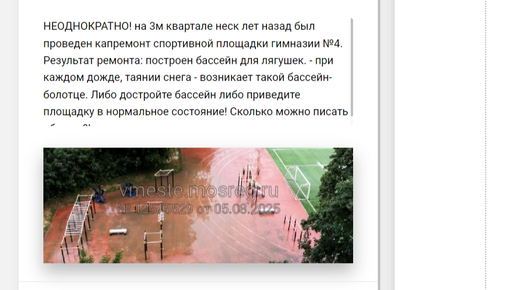 - как отвечает орган, который взял на себя функции исполнительного органа муниципалитета, то есть мэрия, оно же МБУ "Ад-мини-стра-ция". Ситуация: был школьный стадион с естественным покрытием, то есть, песок и трава. Решила мэрия (а мэрия - учредитель школы) сделать современный стадион и покрыла его резиновым ковром. На котором образуются лужи, а зимой - лед.