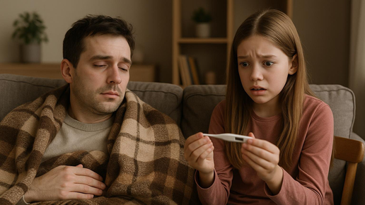 "Тётя Наташа, папа заболел. У него температура высокая, и он такой бледный..."