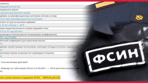 Продолжим расчеты возможных пенсионных выплат представителей силовых ведомств. Какую максимально возможную пенсию сможет получить младший инспектор Федеральной службы исполнения наказаний? Информация с сайта ВОЕННОЕ ПРАВО. Разберемся с основными показателями. Звание — старшина внутренней службы. Выслуга лет в льготном исчислении — 32 года. Календарных лет выслуги — 25. Расчет будем проводить на калькуляторе пенсии ФСИН. Давайте узнаем, какая она — пенсия инспектора ФСИН. Расчет пенсии на калькуляторе...