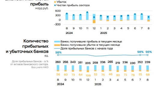 Банковский сектор: прибыль рухнула вдвое По данным ЦБ, чистая прибыль банков в августе — 203₽ млрд. Это вдвое меньше, чем месяцем ранее (397₽ млрд), и заметно слабее августа 2024 г. (435₽ млрд). Доходность на капитал просела с 24,9% до 13%. Что давит на прибыль: 👉Основная прибыль сократилась до 192₽ млрд (в июле — 285₽ млрд). Минус дали: ▪️снижение чистых процентных доходов (-36₽ млрд, переоценка юркредитов с плавающей ставкой), ▪️рост отчислений в резервы (+67₽ млрд). 👉Волатильные доходы — 90₽ млрд (-64₽ млрд к июлю)...