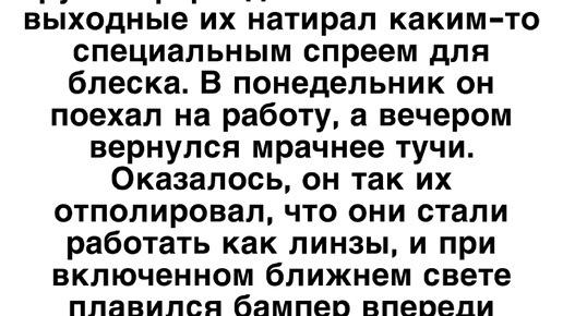 1. Полировка для папы Мой папа купил себе новые крутые фары для машины и все выходные их натирал каким-то специальным спреем для блеска. В понедельник он поехал на работу, а вечером вернулся мрачнее тучи. Оказалось, он так их отполировал, что они стали работать как линзы, и при включенном ближнем свете плавился бампер впереди идущей машины. Гаишник, останавливая его, сказал: «Мужик, у тебя там не фары, а прототип лазерной пушки». 2. Операция «Тихое возвращение» Мой парень вернулся из командировки на день раньше, чтобы сделать мне сюрприз...