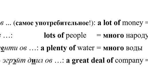 1. Сначала запомните 4 варианта передачи понятия «много …», которые можно употреблять с чем угодно (знать их - хотя бы пассивно! - нужно в любом случае): Немного юмора и стихов для быстрого запоминания *** «МНОГО» = “MUCH”, и «МНОГО» = “MANY”, Ставят Петю на колени! Но Петя наш - не идиот! Говорит везде “A LÓT …”! *** «“There ARE MANY …”, “There IS MUCH …” - - Вот решение задач! (Но: чтоб уйти от всех забот, Говори: “There IS A lót …”)». РЕКОМЕНДАЦИЯ: Если есть сомнения, какое «МНОГО...