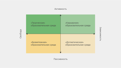Опираясь на типологию Корчака, Витольд Ясвин предложил определять типы образовательной среды по двум главным признакам — насколько образовательная среда поощряет свободу и активность ученика. На основе этой гипотезы Ясвин разработал методику векторного моделирования образовательной среды. Она сейчас широко применяется в педагогике для формирования образовательной среды. Именно ей мы и воспользовались в своем лицее для реализации проекта по созданию личностно-развивающей образовательной среды (далее - ЛРОС) "Образование-это PRO100"...