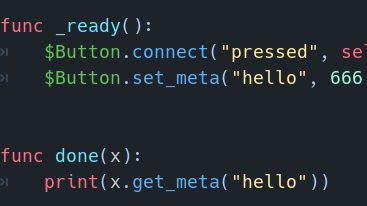 Метадатой может быть всё что угодно. Любой тип данных. Подключается через set_meta(). Необходимо дать имя мете, и указать данные. Читается мета через get_meta(). Можно проверять наличие той или иной меты у ноды через has_meta(). Допустим в какой либо выборке. Пример кода, где к кнопке мы подключаем мету,...
