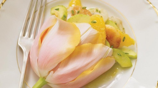 Решила я в честь 8-го марта погуглить про съедобные цветы. Ну мало ли. И вот те на, в списке оказались тюльпаны! Такое нельзя оставить без внимания, надо разобраться подробнее. Оказывается, у тюльпана съедобны* все части – луковица, листья, цветы. Как пишут в обзорах, запечённые луковицы по вкусу похожи на картошку, листья – на огурец или салат, лепестки – на стручки горошка. Я не смогла найти блюда из тюльпанов в красноярских, да и вообще в российских, ресторанах. Все отсылки на страны Европы и Канаду...