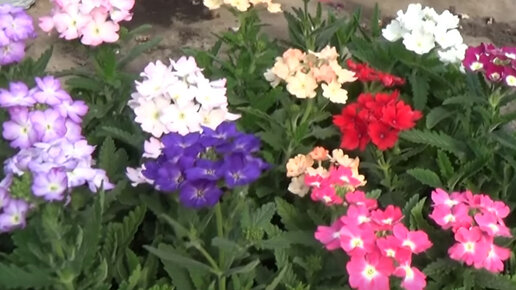 Всем привет друзья, сегодня я поговорю о том как правильно прищипывать вербену. Вербену мы берем разными пачками семена в магазинах разноцветные, она у нас невысокая 25-30 сантиметров высота максимум. Вся имеет раскраску, видите, синие темно-розовые, красные и с точками и без, и однотонные. И чисто красная с белой. Вербена у нее яркие насыщенные цвета, они у нее не блекнут, ее можно использовать как в виде живого бордюра, пересаживать ее надо после того как минует угроза заморозков и она цветет буквально до конца октября почти полностью весь сезон...