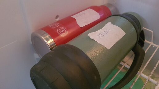 Вчера Яндекс Дзен подсунул мне статью, в которой автор нахваливает литровый термос. Мол, он держит кипяток чуть ли не трое суток, поэтому такой термос должен быть у каждого. Я пользуюсь термосами больше 5 лет и мне слабо верится, что термос объёмом 1 литр может столько держать температуру. Даже если он будет утеплён супер-мега-нано технологичными материалами. Решил провести эксперимент. Взял 2 термоса: один объёмом 1,2 литра, второй 1,8 литра. В каждый налил кипяток и положил термосы в холодильник...