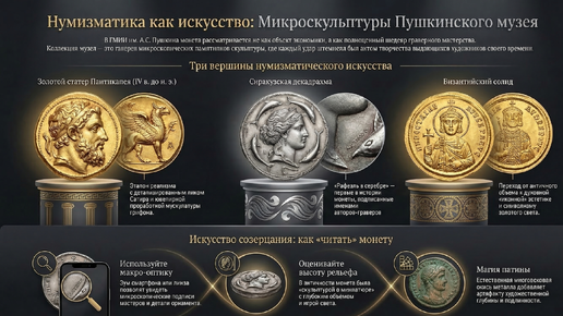 Монета — это самый массовый и в то же время самый интимный вид искусства. Она веками переходила из рук в руки, стираясь о ладони, но сохраняя в себе гений античных мастеров и амбиции правителей. В залах ГМИИ им. А.С. Пушкина монеты лишены своего утилитарного блеска: здесь они выступают в роли микроскопических памятников скульптуры. Это застывшие в золоте и серебре лики богов, тончайшая мускулатура мифических существ и архитектурные ландшафты, уместившиеся на диске диаметром в пару сантиметров. Приглашаю...