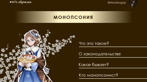 📌 Монопсония — явление на рынке, при котором существует единственный покупатель, контролирующий спрос, устанавливающий цены и регулирующий условия сделок. Для монопсонии характерно отсутствие альтернатив для продавцов и неконкурентоспособность других потребителей. Всё, как в монополии, но наоборот :D Основное различие между монополией и монопсонией состоит в том, что монополия — это когда есть 1 продавец, а монопсония — это когда есть 1 покупатель. • В монопсонии есть только один покупатель, что даёт ему значительную власть...