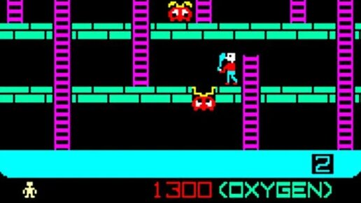 Вот с этой простейшей игры, по сути, и началась вся мировая игровая "движуха". По крайней мере с неё начались все остальные платформеры. Простейшей она была и по графике, и по игровому процессу. Герой не мог даже прыгать. Зато мог рыть ямы, в которую должны были попасть враги... И тут начиналась форменная дикость. Бедного красного "колобка", попавшего в яму, нужно было ещё и добить лопатой, чтобы он провалился в неё окончательно. Выглядит это, по-моему, крайне жестоко. Кстати, несмотря на бесхитростность игры, американцам она показалась слишком сложной...