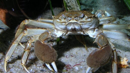 Необычный краб с мохнатыми клешнями-рукавичками, стал отмечаться на берегах Чёрного и Азовского морей сравнительно недавно. Вредный пришлый вид с мощным экономическим потенциалом.