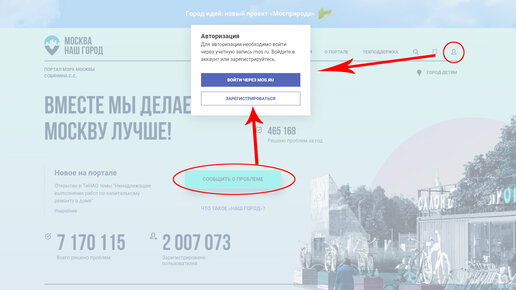 Вас попросят войти через mos.ru или зарегистрировать аккаунт. У большинства жителей Москвы, скорее всего есть аккаунт mos.ru После входа, опять нажимаем "сообщить о проблеме". Еще тут можно перейти в свой кабинет, проверить заявки и прочее. Ищем...