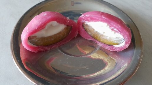 Попробовав японский десерт моти из обычной рисовой муки, я решила всё же сделать «классический вариант» из специальной клейкой муки. Ингредиенты: Для теста: клейкая рисовая мука — 150 г., сахарная пудра — 50 г., вода — 250 мл., натуральный краситель — по желанию. Для начинки: слива — 4-6 шт., сливочный сыр — 140 г., сахарная пудра — по вкусу. Рисовое тесто я буду готовить на водяной бане, поэтому воду нагреваю заранее. Также заранее можно приготовить начинку. Сливы разрезаем пополам и удаляем косточки...