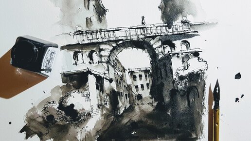 Как рисовать городской вид - здания, мост и улицу. Перо, тушь и упрощающая все - водная кисть