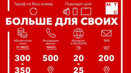Ни для кого не секрет, что крупные компании всячески поощряют своих сотрудников и партнеров, предлагают свою продукцию по низким ценам и т.д. Операторы сотовой связи не исключение. А название тарифного плана «Больше для своих» уже говорит само за себя: выгодные условия в пользовании связью для своих сотрудников, их родственников и друзей, а также партнеров компании МТС. Низкая абонентская плата: 300-350 руб в месяц в зависимости от региона номера, на котором стоит тариф. Для обладателей номера Москвы или МО будет 350 руб/мес, для большинства других регионов - 300 руб/мес...