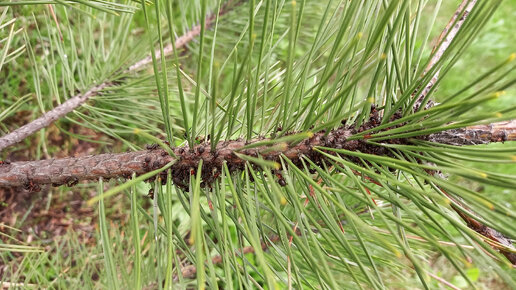 Весной на маленькой сосенке появилось много чёрной, крупной тли. Ну и конечно же целые полчища муравьёв. Вся сосна была буквально облеплена этоми вредителями. Медлить было нельзя, спасать её нужно было срочно. Чтобы муравьи не могли залезть на дерево, сделала "юбку" из целофана. Для этого взяла полоску целофана шириной приблизительно десять сантиметров и закрепила её скотчем вокруг ствола в виде юбки. На ствол под юбкой и саму юбку с внутренней сторороны нанесла клей для грызунов. Так его не смоет дождём и он не припылится...
