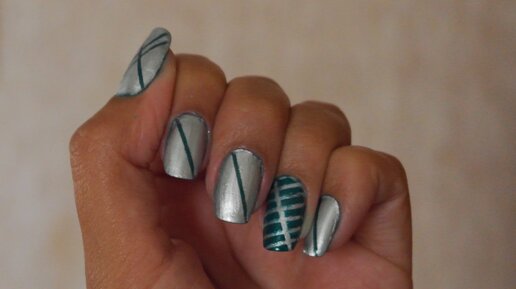 Для такого дизайна надо использовать хорошо пигментированный лак, который за один тонкий слой покрывает лак-подложку. А иначе получаются толстые наплывы и съезжают сами полоски при отклеивании ленты. Зеркальный лак Калейдоскоп отлично подходит для подобной задачи, а вот Ados совершенно не справился и испортил общую картину :( Сначала покрываем весь ноготь лаком того цвета, какого хотим видеть впоследствии полоски. Даём лаку полностью высохнуть. Далее приклеиваем самоклеющуюся ленту в нужном порядке...