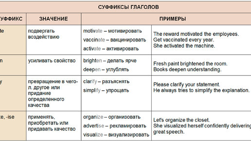 Способы образования глаголов в английском с помощью суффиксов, значение суффикса и его происхождение: Добавление суффикса "-en" Пример: strengthen (укреплять) - от существительного "strength" (сила, мощь). Значение суффикса: Добавляет значение "делать или превращать в". История: Суффикс "-en" происходит из староанглийского "-nian" и германского "-njan". В современном английском языке он используется для образования глаголов, придающих пассивный или каузативный характер действию. Добавление суффикса "-ify" Пример: simplify (упрощать) - от прилагательного "simple" (простой)...