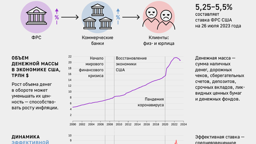 26 июля Федеральная резервная система (ФРС) США повысила ставку до 5,25–5,5%. Ставка ФРС — процентная ставка, по которой американские банки предоставляют свои избыточные средства в кредит другим коммерческим банкам. Соответственно, ее изменение влияет и на стоимость кредитов для клиентов: физических и юридических лиц. Также ставка позволяет влиять на объем денег в обороте и контролировать инфляцию. Ценность денег является одним из показателей, на который ФРС ориентируется при установлении диапазона ставки...