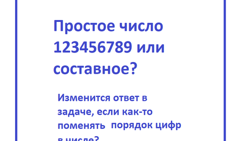 Задача. Запишем подряд цифры от 1 до 9, получим число 123456789. Какое это число - простое или составное? Изменится ли ответ в задаче, если как-то поменять порядок цифр в этом числе? Простое число это то число, которое делится на само себя и на 1. То есть переиначивая вопрос задачи, делится ли число 123456789 на какое-либо число, кроме, как на 1 и на 123456789? Или на какие числа делится это число? Как решить эту задачу без калькулятора, а только применяя свойства делимости чисел? Напоминание: Простое число - такое число, которое делится только на 1 и само себя...