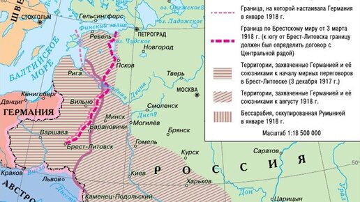 Ленин называл условия Брестского мира, заключенного в марте 1918 года, "похабными". Хотя и сам настаивал на его подписании. И слово "похабный" — это довольно мягкое определение. Ведь по итогу страна потеряла территории площадью чуть меньше миллиона квадратных километров с населением в 56 миллионов человек. А помимо того — 90% добычи угля, 73% железной руды и почти половину всей промышленности. Границы России вернулись к эпохе Бориса Годунова, на страну наложили огромную контрибуцию, заставили отказаться от армии и флота и предоставить немцам право наибольшего благоприятствования в торговле...