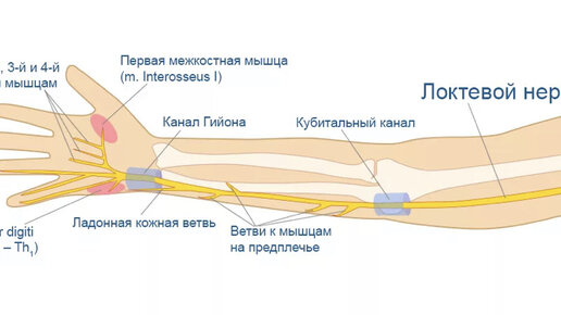 Анатомия. Локтевой нерв отходит от медиального пучка плечевого сплетения и спускается по медиальной поверхности плеча, огибая сзади медиальный надмыщелок плечевой кости, затем идет по борозде локтевого нерва, где прилежит непосредственно к этой кости. Т.к. покрывающий его слой мягких тканей здесь тонок, то нерв легко можно ущемить. В таких случаях он сдавливается между костью и мягкими тканями. На предплечье локтевой нерв иннервирует мышцы, расположенные вдоль локтевой кости на ее ладонной поверхности (локтевой сгибатель запястья, медиальный отдел глубокого сгибателя пальцев)...