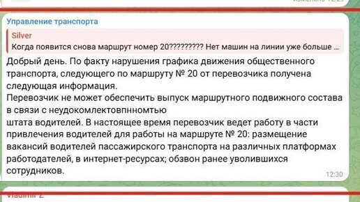 Более месяца маршрут №20 отсутствует на линии. При этом Управление транспорта дезинформирует граждан, утверждая, что разбирается с перевозчиком в суде. Когда мы уточнили у Управления транспорта, какие меры принимаются для восстановления движения маршрута №20, они ответили, что судятся с перевозчиком. Мы запросили информацию по арбитражным искам, но так и не нашли подтверждений. Тогда направили официальное письмо, и в ответе Управление подтвердило, что действительно подавали иск в суд, но не по маршруту №20...