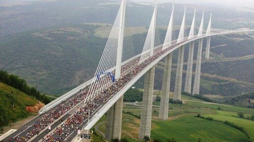 В мире есть не мало уникальных технических сооружений, которые демонстрируют невероятное развитие нашей науки и техники. Об одном из них сегодня пойдёт речь. Виадук Мийо (сооружение мостового типа, мост) был построен в 2004 году. Мост расположен на юге Франции и является частью скоростной трассы А75, ведущей в столицу. Движение здесь достаточно плотное и за день по мосту может проехать несколько десятков тысяч машин. Доступны по 2 полосы в каждом направлении. Самое интересное это высота моста. Строение представляет собой конструкцию, держащуюся на 7 жёстких опорах со множеством стальных тросов...
