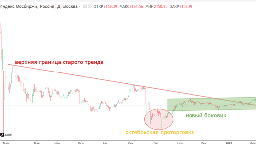 Скоро год с очередного февральско-мартовского обвала. Можно и обзор с итогами. Это становится хорошей традицией: в конце февраля - начале марта по чётным годам - обвал на бирже. Так было в 2020 и в 2022. И вообще, предлагаю биржевой год считать с 1го марта по 1 марта. Кстати, у древних римлян Новый Год и был в марте, отсюда и названия месяцев: "октябрь" - дословно восьмой, "декабрь" - дословно десятый. Признаков смены два: выход графика за пределы старого коридора и зона проторговки. Сейчас график не только прогрыз потолок коридора (грыз целых 10 дней в январе, с 17...