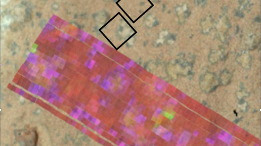 рис. 1. Карта минералов. Источник: НАСА. Марсоход NASA «Персеверанс» составил эту карту минералов, на которой показано наличие двух минералов — вивианита (фиолетового и розового) и грейгита (тускло-жёлтого и зелёного) — на поверхности скалы, получившей название «Водопад Чейва». Эти данные помогли учёным определить, что скала содержит потенциальную биосигнатуру — вещество или структуру, которые могут иметь биологическое происхождение, но требуют дополнительных данных или дальнейшего изучения, прежде чем можно будет сделать вывод об отсутствии или наличии жизни...