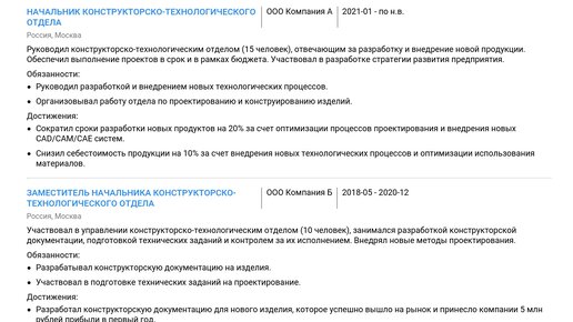 Пример резюме начальника конструкторско-технологического отдела 2025
