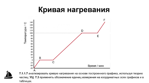 Разобравшись с охлаждением, перейдем к процессу нагревания. При этом нам встретятся два фазовых перехода. Вспомним их названия! Это кипение или же его можно назвать парообразование. Процесс перехода из твердого состояния в жидкое называется плавление. Для воды этот процесс также можно назвать таянием. Кривая нагревания представляет собой график, где по оси абсцисс отложено время, а по оси ординат – температура. В целом при нагревании температура возрастает. На графике могут присутствовать до двух...