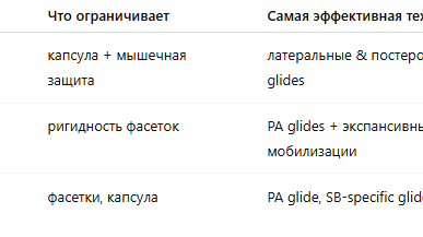 Требуется понимание: формы фасеточных суставов, правил скольжения (glide), вектора ограничения, какие движения безопасны, а какие — нет, когда работать, а когда категорически нельзя. Это статья создаёт фундамент, без которого невозможно безопасно выполнять мобилизации позвоночника...