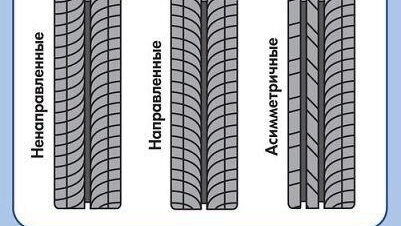 Рисунок протектора образуется определенным расположением его элементов относительно друг друга и направления вращения шины. На любом типе шины может быть использован ненаправленный, направленный или асимметричный рисунок протектора, что оказывает существенное влияние на ее эксплуатационные характеристики. 1 - ненаправленная шина устанавливается на автомобиль произвольно; 2 - направленная шина устанавливается на автомобиль по направлению стрелки на ее боковине; 3 - асимметричная шина устанавливается...