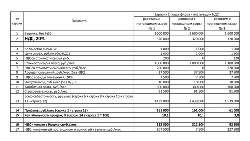 До 2025 года у нас был выбор: работать «без НДС» или «с НДС». Под этим в большинстве случаев подразумевалось: выбрать упрощенную систему налогообложения или общую. Сейчас нам нужно выбирать не только систему налогообложения, но и ставку НДС. Посчитаем? Представим рынок, на котором есть следующие субъекты: Допустим, что наша фирма закупает каждый месяц 1000 кг сырья, производит продукцию (добавляет к стоимости сырья еще стоимость производства – заработную плату (300 000 руб.) и страховые взносы (91 500 руб...