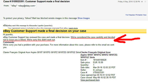 Жаль, когда сервис, с которым работаешь много лет вдруг дает сбой. Я заказывал на Ebay всякие товары раз 30 за последние несколько лет. Никогда не имел проблем. Пару раз товар не приходил, но деньги возвращали всегда, причем не продавец, а сам Ebay по программе защиты клиента. И вот, в конце марта заказал клавиатуру для ноутбука. Прошло полтора месяца, товара нет. Обращаюсь в клиентскую поддержку и те отвечают, что поскольку товар был отправлен заказным почтовыми отправлением, то любые неувязки с почтой - это проблемы покупателя...