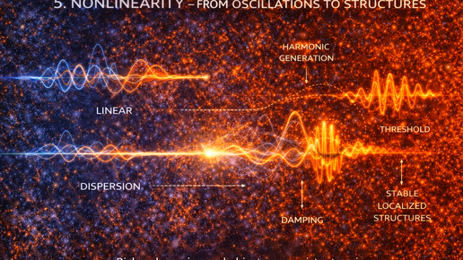 До этого мы двигались по “мягкой” линии: волна, 1/r² как геометрия, дисперсия как масштабность, затухание как память носителя. Всё это можно обсуждать в рамках почти линейного мира: маленькие возмущения, аккуратные пакеты, предсказуемые отклики. Но реальность – не линейная. И самое важное: без нелинейности носитель остаётся слишком бедным, чтобы из него вырос мир с объектами, порогами, устойчивыми формами и “режимами” как отдельными сущностями. Если в этом цикле есть выпуск, который объясняет, почему среда вообще нужна как фундамент, то это он...
