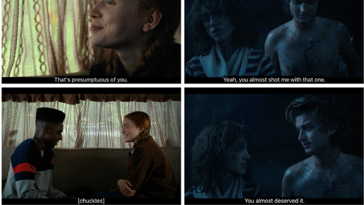 Пересмотрев последний сезон, я особенно обратил внимание на параллели в отношениях Лукаса/Макса и Стива/Нэнси, которые выходили далеко за рамки их поверхностного сходства. В 4 сезоне Максу удаётся скрыться от Векны, «спрятавшись на свету», то есть цепляясь за счастливые воспоминания, как за маяки надежды во тьме. Как ни странно, распавшиеся пары Люмакс и Стэнси мирятся и переживают самые нежные и тёплые моменты утешения в самый, без сомнения, тёмный период сериала (в отличие от разногласий в семье Джейнси, которые только усугубляются средь бела дня, ещё до того, как наступил весь этот хаос)...