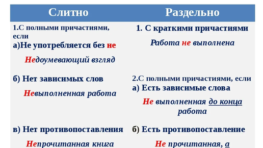 Частица НЕ пишется раздельно: 1. При противопоставлении с союзом а. Например: Не прочитанная книга, а просмотренная. 2. С зависимыми словами кроме слов наречий меры и степени. Например: Не прочитанная мной книга. 3. При подчеркнутом отрицании. Например: Нет, это книга не прочитанная. 4. С причастиями в краткой форме. Например: Книга не прочитана. Частица НЕ пишется слитно: 1. Если слово без "не" не употребляется...