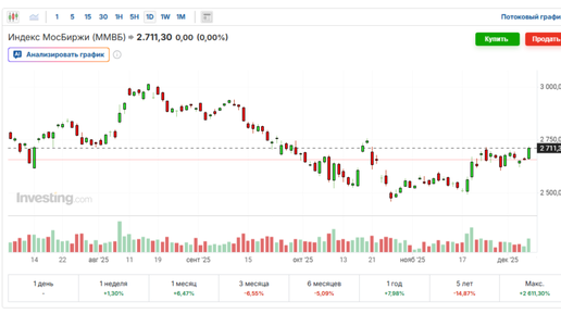 На прошедшей неделе индекс Мосбиржи еще немного вырос, преодолел отметку 2700 пунктов и двинулся выше. Сейчас он находится на максимальных уровнях за последние пару месяцев. В конце ноября я написал о том, что в декабре наиболее вероятен рост, ожидаю заход индекса в диапазон 2800-3000, написал, что рост начнется уже с первой недели декабря. Многие восприняли это скептически, что видно по комментариям, но пока все движется в этом направлении. Конечно, ни в чем нельзя быть уверенным на 100%, я пишу лишь свое мнение, исходя из ситуации на конкретный момент...