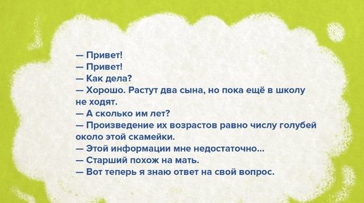 Задача, которая на первый взгляд кажется абсурдной. Но если хорошо подумать — можно найти точный ответ. Абсолютно логичный. Такие задачки учат преодолевать нетривиальные препятствия. Постарайтесь решить самостоятельно. Делитесь решением в комментариях, как рассуждали? - Привет! - Привет! - Как дела? - Хорошо. Растут два сына, но пока ещё в школу не ходят. - А сколько им лет? - Произведение их возрастов равно числу голубей около этой скамейки...