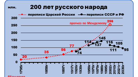 Интернет пестрит сообщениями о сокращении русских. Почему это происходит? И когда началось? Об этом почти никто дальше прошлого года даже не взглядывает. А истребление — это самое точное определение того, что происходит с русским народом. И началось оно давно. Дмитрий Иванович Менделеев в начале 1900-х рассчитал возможную численность России к 2000 году - 594 млн. Русских в России к 2000 году, при расчете по методу Менделеева, должно было быть - 258 млн. А по переписи 2002 русских в России – лишь 116 млн...